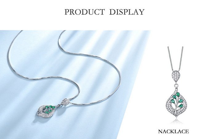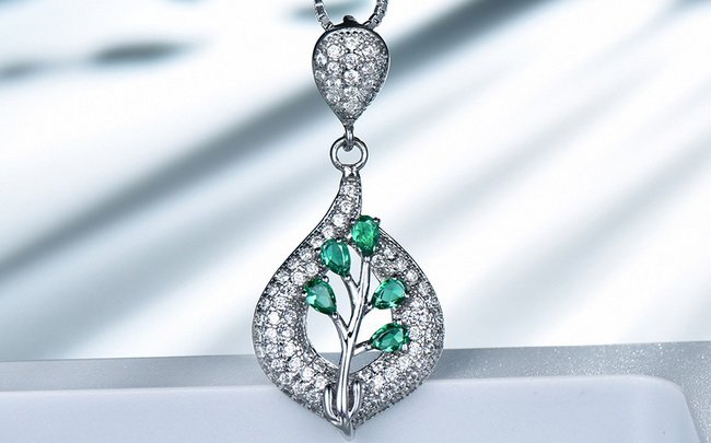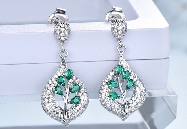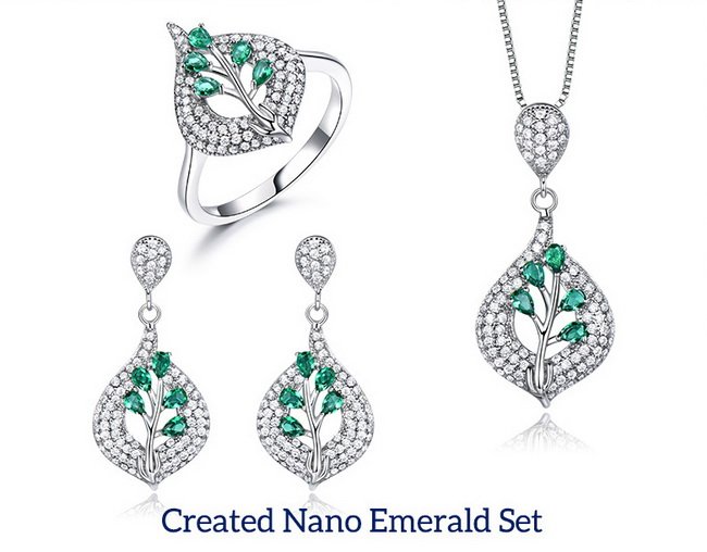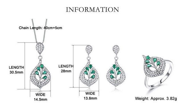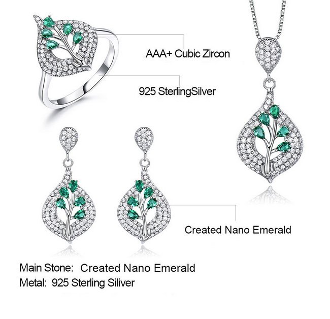 Silver 925 Emerald and White Diamond Pendant Earrings Ring Gift Set For Women